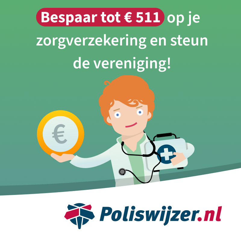 Dit jaar doen wij mee aan de Poliswijzer-sponsoractie. Vergelijk je zorgverzekering via onze unieke link en steun daarmee direct onze vereniging. Voor elke overstapper ontvangen wij een bijdrage.
